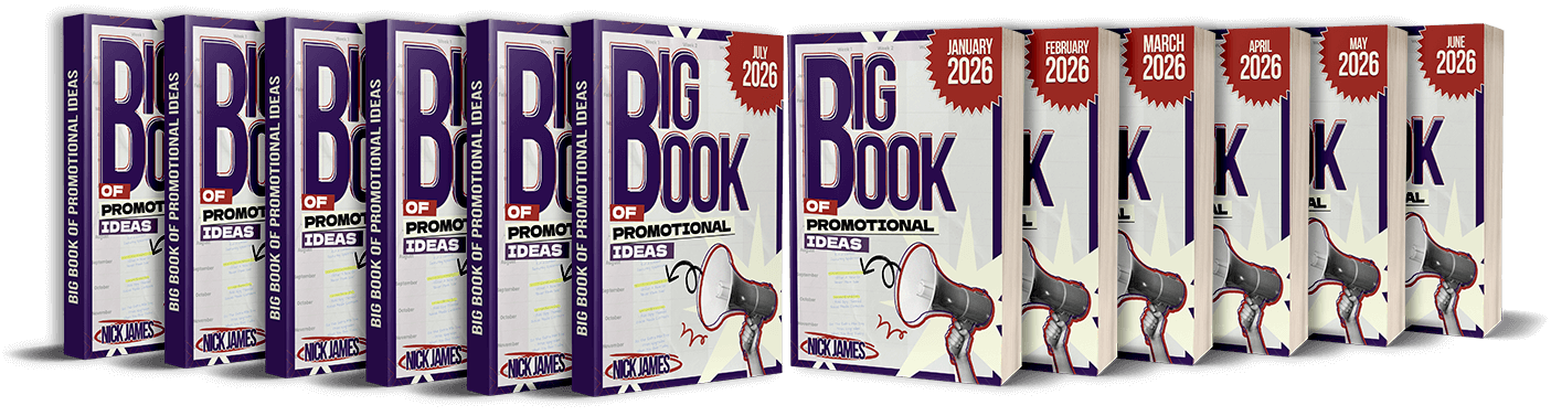 It’s called ‘The BIG Book Of Promotional Ideas For 2026’ and it contains over 900+ promotional ideas that you can use throughout the year, so that both you and your products and services will stay at the forefront of your customer’s attention.